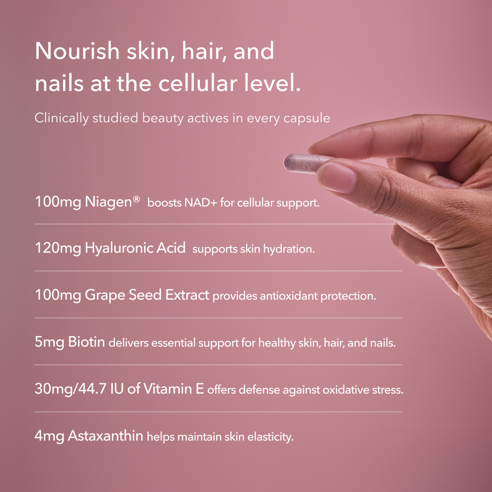 A first-of-its-kind beauty supplement combining patented NAD+ boosting Niagen® with targeted beauty actives to support your skin, hair, and nails at the cellular level. Get the details