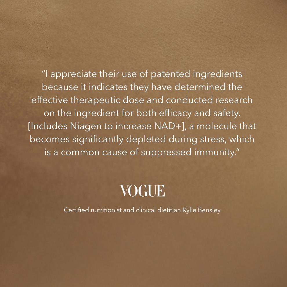 With 150mg of Niagen® to restore NAD+ for cellular energy, plus VegD3® vegan vitamin D, fermented vitamin C, two bioavailable forms of zinc, and Theracurmin® highly absorbable curcumin. This formula supports resilience—supporting cells before and during challenges.