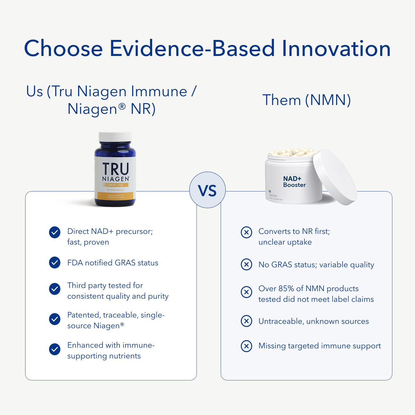 Tru Niagen is a superior choice compared to other NAD supplements because it contains Niagen®, our patented nicotinamide riboside (NR), a more bioavailable precursor to NAD+. Niagen® NR is backed by 35+ human clinical studies, and crosses cell membranes easily and is more efficiently converted into NAD+ inside cells, effectively boosting NAD+ levels.