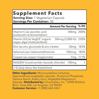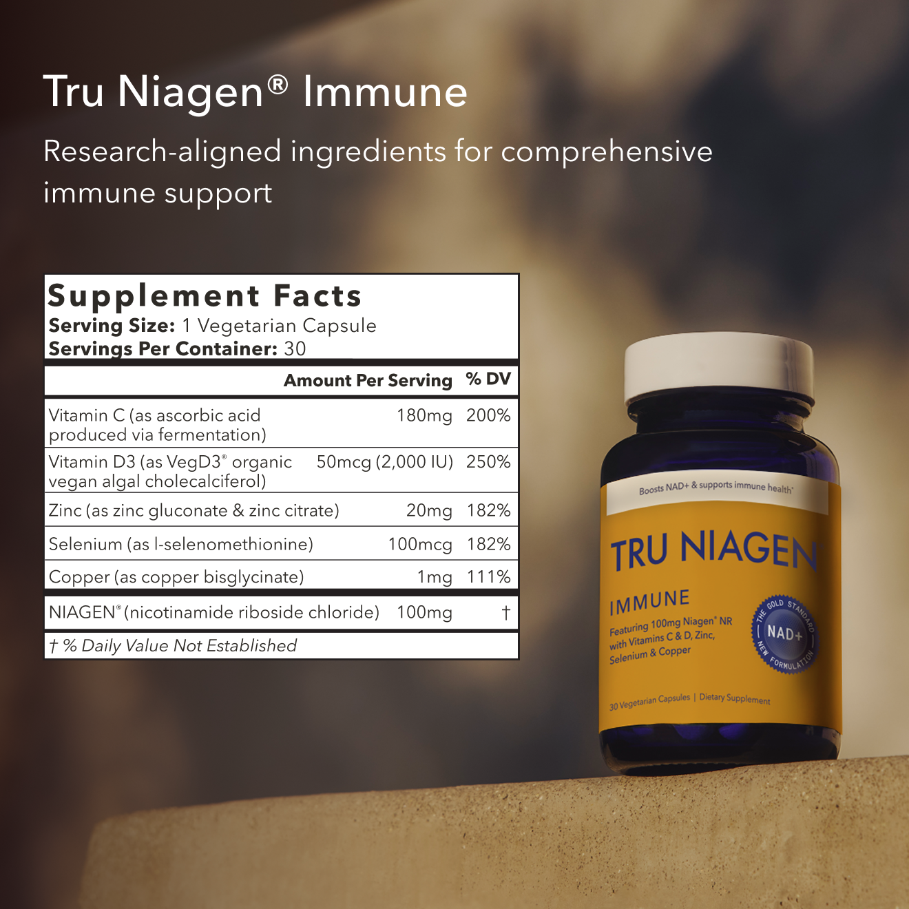 Tru Niagen Immune combines 100mg of patented Niagen® with essential vitamins and minerals—each selected for its clinically studied role in immune function and antioxidant defense.