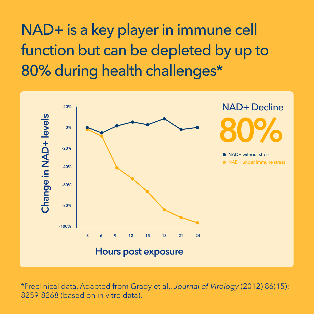 NAD+ is a key player in immune cell function but can be depleted by up to 80% when immune health is compromised.* Provides the NAD+ foundation that both branches of your immune system—innate and adaptive—depend on for optimal energy and cellular repair.