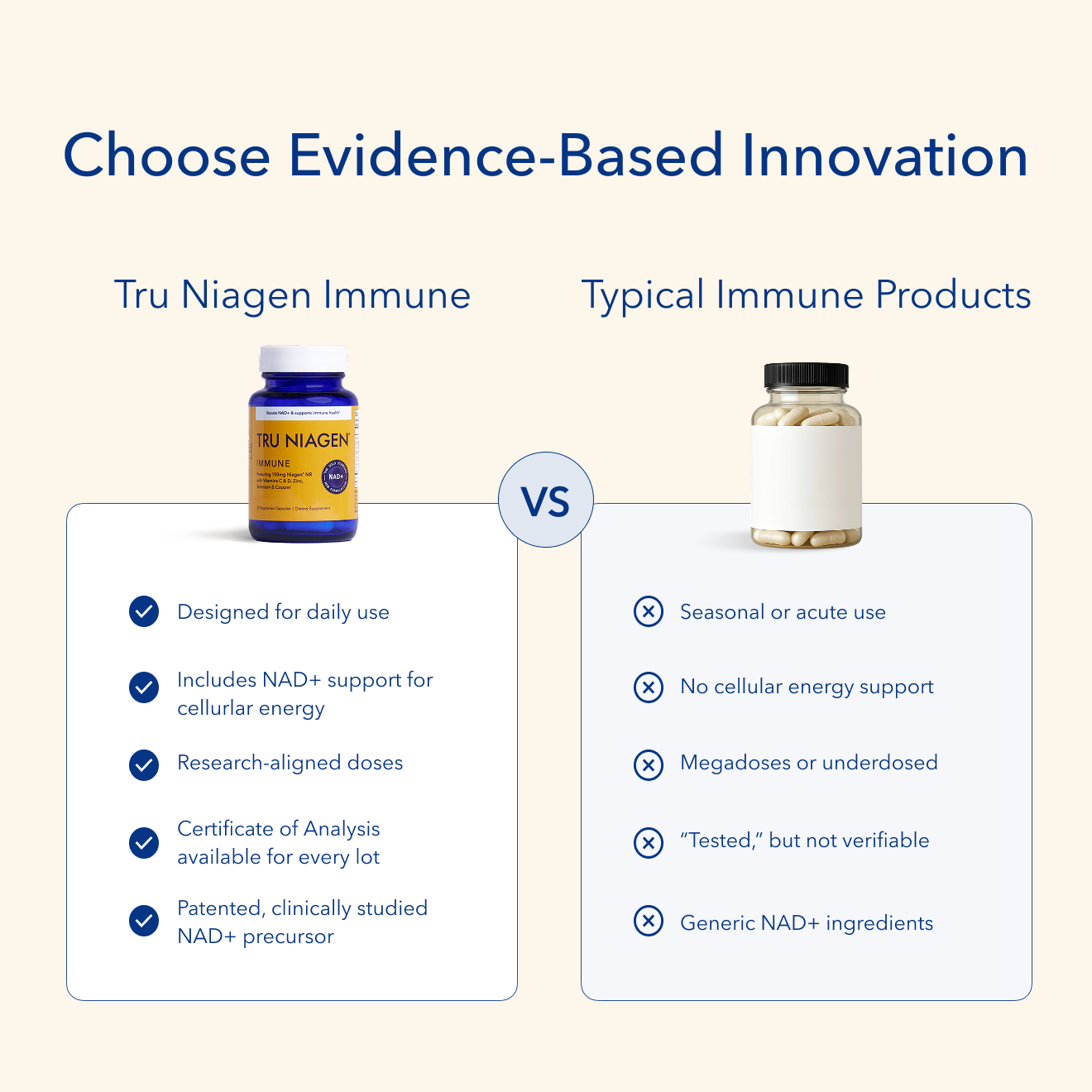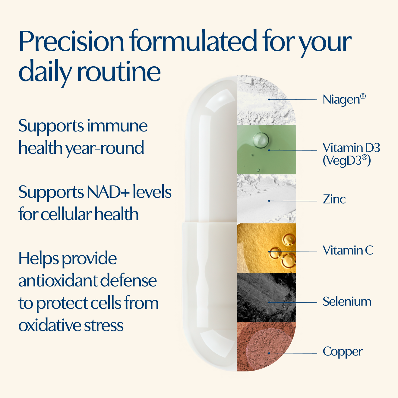 This isn't a seasonal megadose you take when something's already wrong. Tru Niagen Immune is formulated for consistent, everyday support—and stacks seamlessly with Tru Niagen and Tru Niagen Beauty for whole-body benefits.